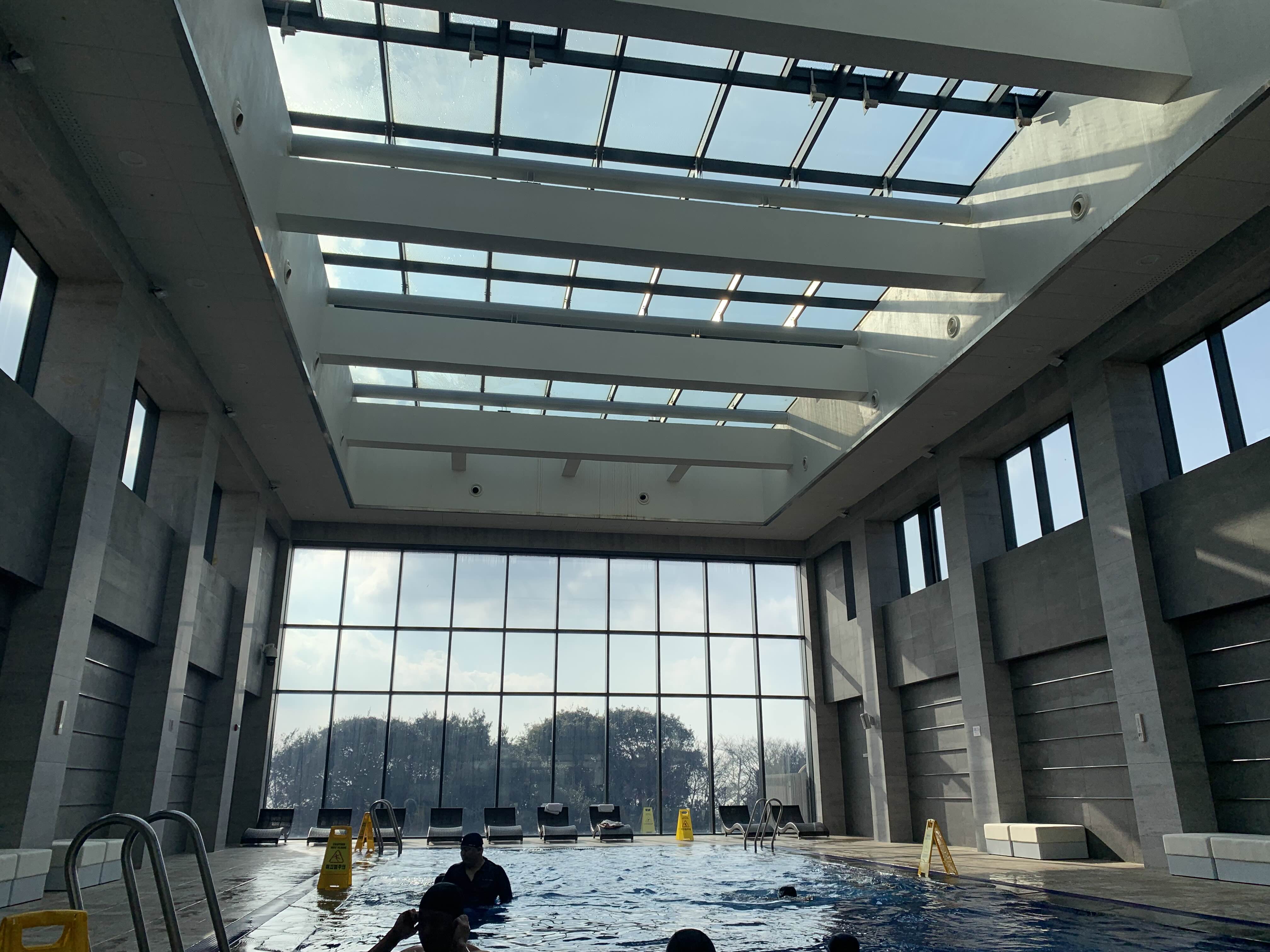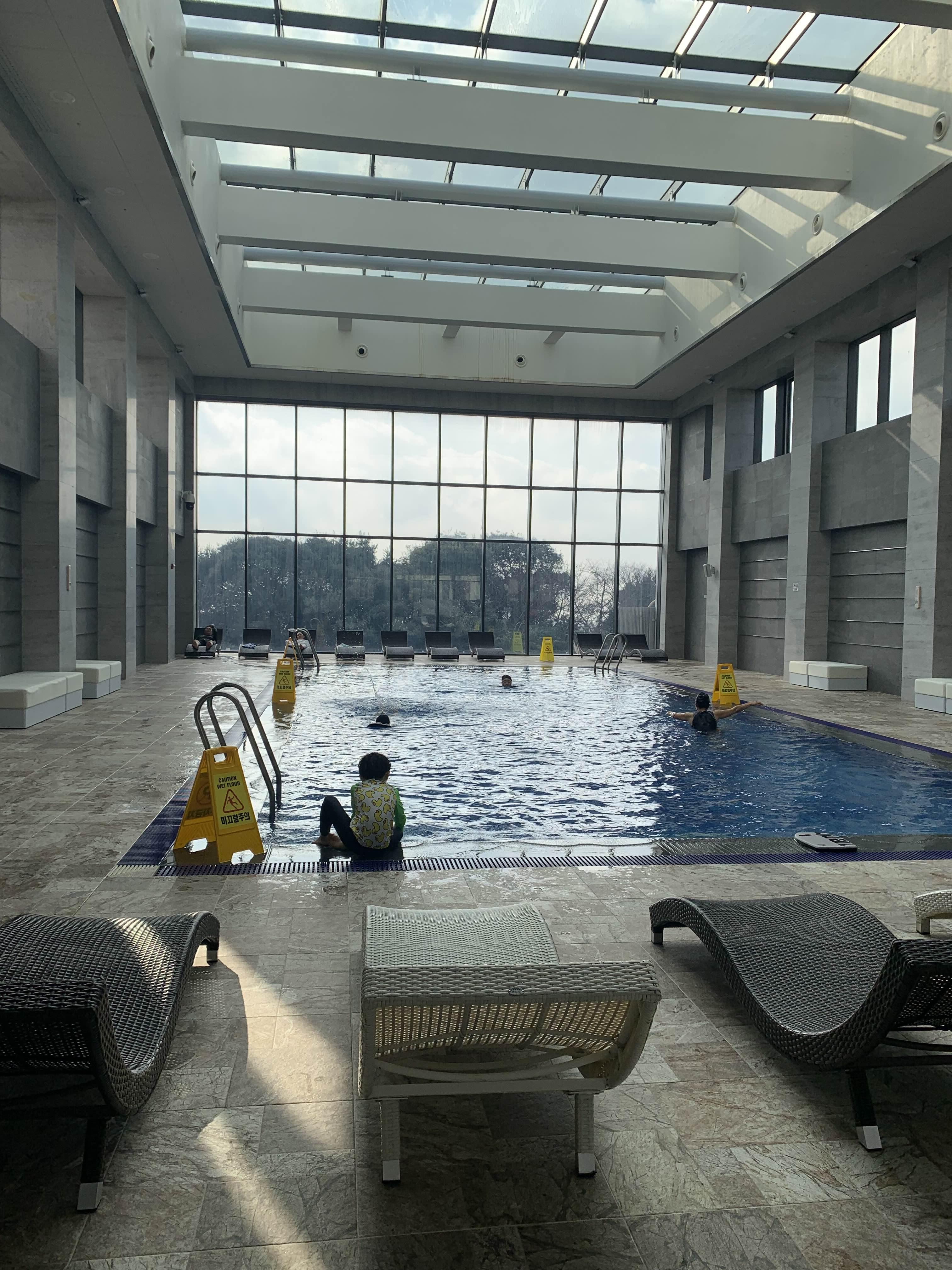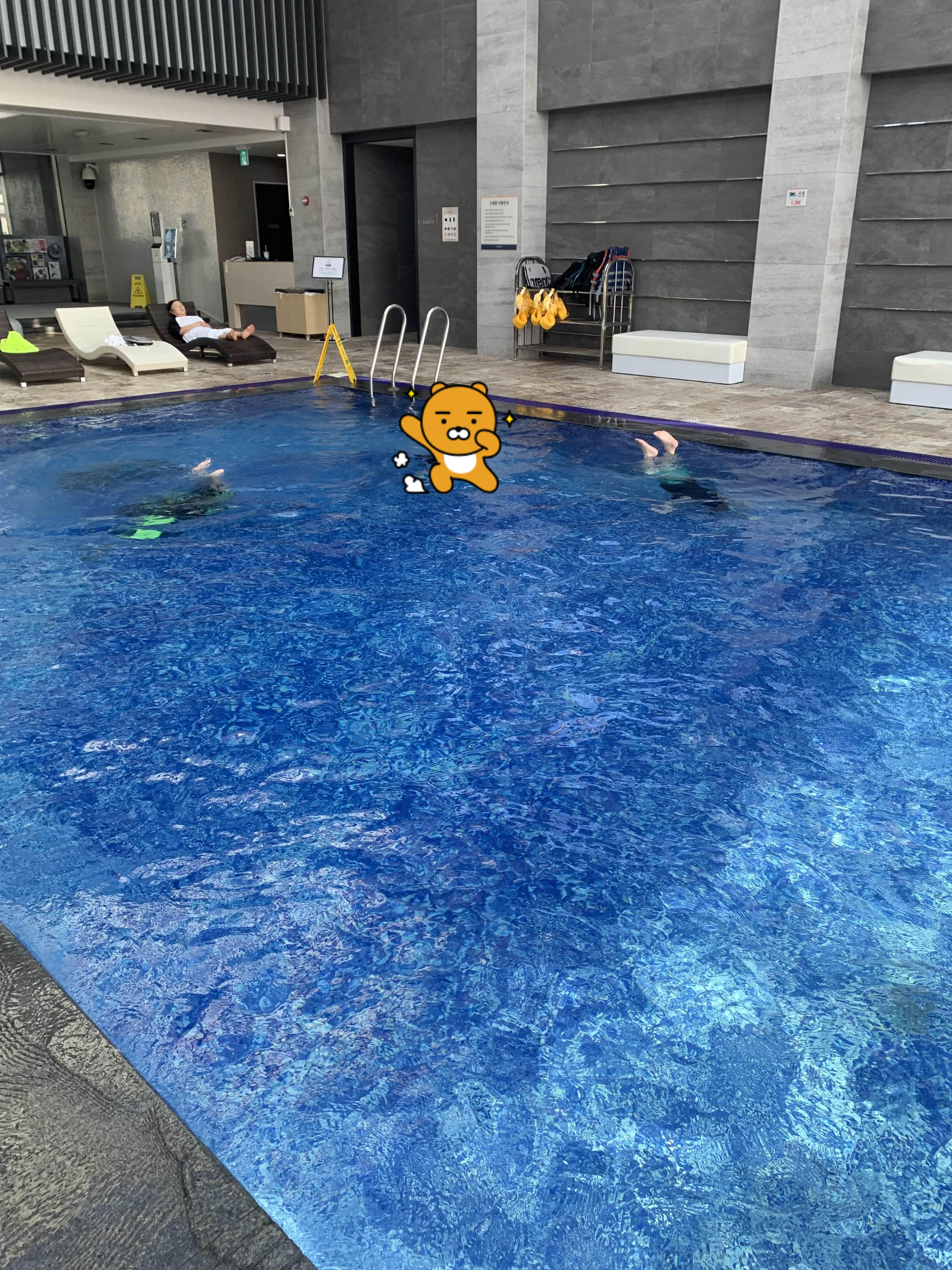수영장 물은 차갑진 않지만 그래도 추위에 민감한 분들은 춥다고 느끼 실 수 있어요.